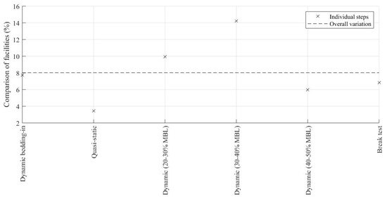 The overall results can be regarded as accurate, since stiffness measurements between both facilities displays good agreement with a mean percentage difference of 8%, as seen in Figure 14. The quasi-static stiffness assessment provides the most accurate performance characterisation, with the least difference between both facilities. The dynamic stiffness values (for the mean range of 30–40% MBL) can be regarded as least accurate, since they display the largest difference between the facilities of over 10%.