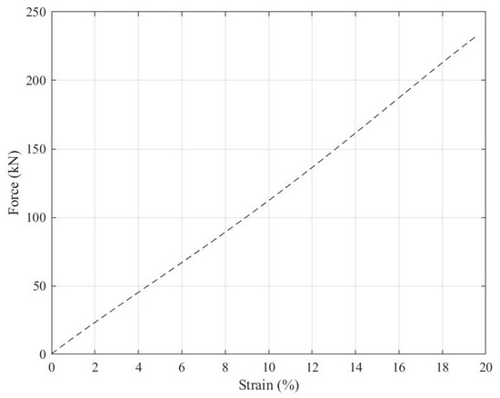 Modelled tensile force-strain behaviour of hybrid rope up to failure.