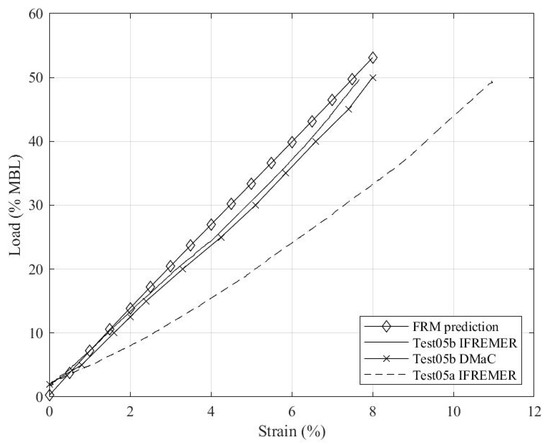 To compare an initial load force-strain plot with the rope model, only Test 05b can be used, as this is the only instance where the rope has already been bedded-in. Figure 16 shows this comparison at both facilities, as well as the initial loading plot for the first implementation of Phase A on the sample (Test 05a) at IFREMER.