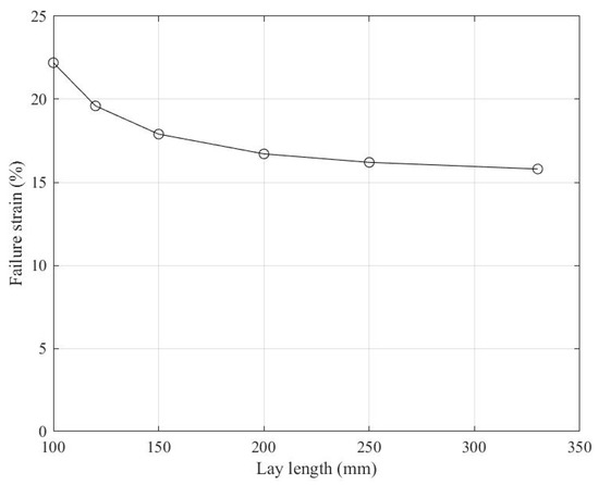 The usefulness of this rope model lies in the possibility to perform virtual studies of the influence of fibre type and rope construction parameters. To illustrate this, Figure 17 presents the influence of the lay length of the three twisted strands on the strain to failure for the hybrid rope.