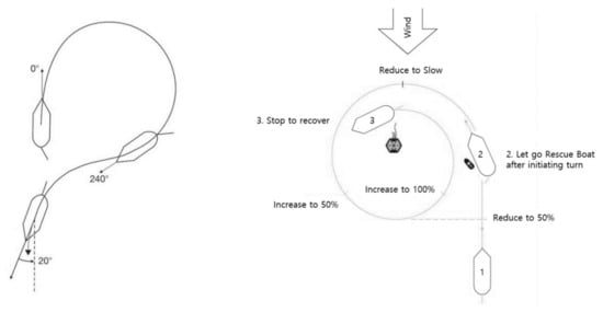 Although these turns are for emergencies, the Shrarnov turn and the Lorén turn, as shown in Figure 2, are not for an ‘immediate action’ situation. According to the IAMSAR manual III, the Scharnov turn takes the vessel back into her wake to save time, as less distance is covered; however, it cannot be carried out effectively unless the time elapsed between the occurrence of the incident and the commencement of the maneuver is known. The primary purpose of the Lorén turn is to facilitate the launch and recovery of a rescue boat, and to quicken the rescue work done by other craft. When executing the Lorén turn, circling the distress scene calms the sea by interfering wave patterns, where the more turbulence that is created, the more favorable the situation will be. Additional ships circling windward can calm the sea further [].