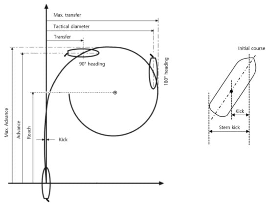 - International Maritime Organization (IMO). Explanatory Notes to the Standards for Ship Manoeuvrability, Annex 2.1.2, 2.1.5 (MSC/Circ.1053); IMO: London, UK, 2002; pp. 6–7. [Google Scholar]