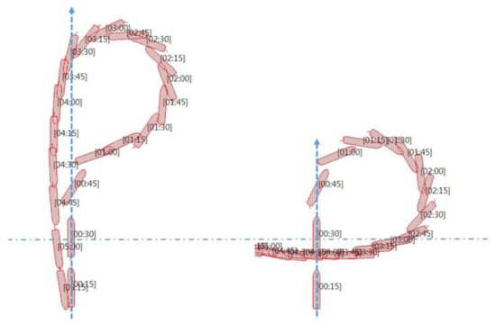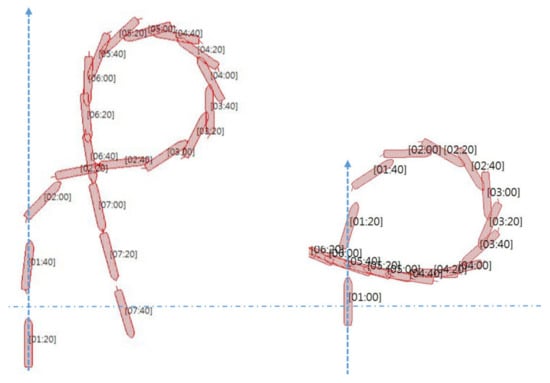 A shipbuilder of the M/V Morning lady provided the results of the Williamson turn in ballast conditions, as shown in Figure 13; on the other hand, the shipbuilder of the T/S Segero provided the results in ballast and full load conditions. It can be seen that the provided information differed. The Morning lady showed the time elapsed and distance from the initial track and final track line on the drawings with respect to meters and the length. The shipbuilder of the Morning lady performed the sea-trial of the Williamson turn, but it was carried out with modified yaw angles. The T/S Segero indicated the rudder used and the time interval from hard starboard (35°) to port side (−35°). The standard heading for turning was 60° and 200° (20° short of opposite course), but turned at the heading of 45° and 240°, as shown in Figure 14. The shipbuilder of the T/S Segero also provided parallel course maneuvers separately.