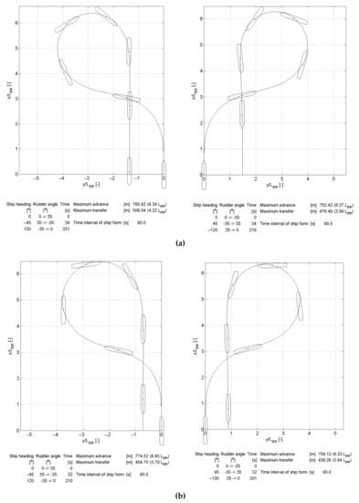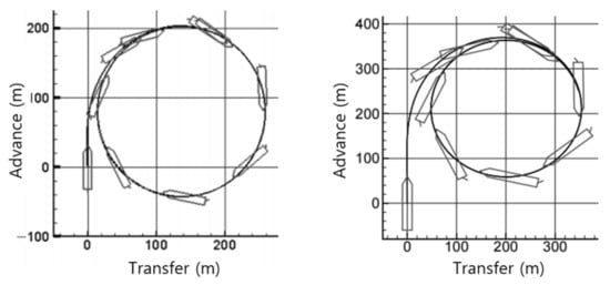 Wind, waves and currents were set as calm for the test simulations. Water depth exceeded four times the mean draft of the ship, in order to avoid the shallow water effect, in accordance with IMO notes on the standards for ship maneuverability []. The test speed (V) was at least 90% of the ship’s speed, corresponding to 85% of the maximum engine output []. The ship’s heading was northward (000°). Rudder hard over was 35 degrees.