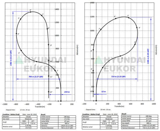 Shipbuilders provide reports of sea-trials, which include turning ability, initial turning ability, yaw-checking and course-keeping abilities, and stopping ability, along with additional considerations. Accordingly, shipbuilders provide drawings of the results, such as the turning test, zigzag test, stopping inertia test and spiral test. In particular, the results of the Williamson turn test are included in the booklets, as shown in Figure 13 and Figure 14.