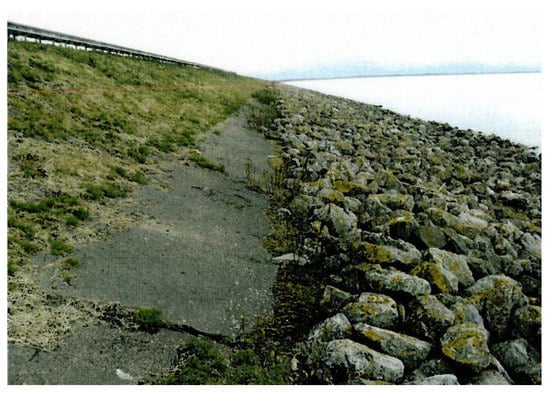 - Bomers, A.; Lopez, J.A.; Warmink, J.J.; Hulscher, S.J.M.H. Modelling effects of an asphalt road at a dike crest on dike cover erosion onset during wave overtopping. Nat. Hazards 2018, 93, 1–30. [Google Scholar] [CrossRef]
