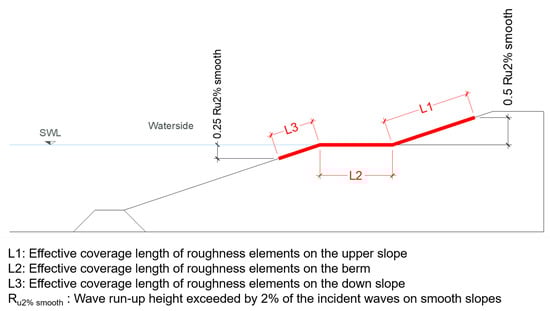 in which is an empirical coefficient which can vary with the type of revetment and the permeability of the structure. A larger value of means a larger reductive influence of the revetment on the average overtopping discharge. For combinations of various types of armour applied along the waterside slopes of dikes, [17] introduced location weighting coefficients to account for different contributions of roughness elements installed on the upper slope, berm and down slope to the overall roughness influence factor.