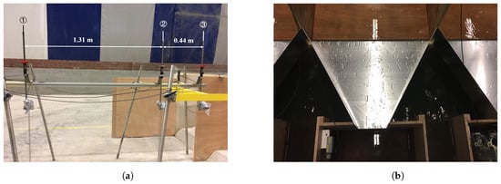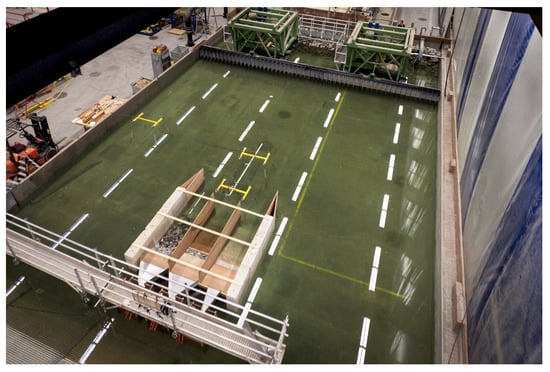 Physical model tests on wave overtopping at rock-armoured dikes were performed in the Pacific Basin at Deltares in the Netherlands, as shown in Figure 3. This is the same experimental facility as applied in [17]. In the following, a review of the experimental facility which was also used in the present investigation is given. The Pacific Basin has a length of 18.6 m, a width of 14 m and a depth of 1.25 m. The basin is equipped with a cradle type wave board which is capable of generating both regular and irregular long-crested waves. This wave board makes use of a second order wave control to compensate for spurious waves. An irregular wave condition was applied in all of the physical model tests based on the JONSWAP spectrum with an enhancement factor of = 3.3. Wave conditions were measured by using three wave gauges installed near the toe of the modelled structures as shown in Figure 4a. The incident and reflected waves were separated by using the method given by [19]. The analysis was based on the time series of incident waves. The spectral significant wave height ( = 4) and the wave period ( = ) were obtained from the measured wave energy spectra. In [20,21] the wave period was found to appropriately describe the influence of wave energy spectra on wave run-up and wave overtopping. A wooden tank was placed behind each model to collect the overtopped water led by a chute connecting with the inner edge of the crest (see Figure 4b). One wave gauge was installed in each overtopping tank to measure the variations of water level, in which way the volume of overtopping water can be determined.