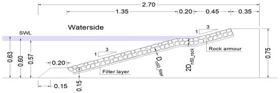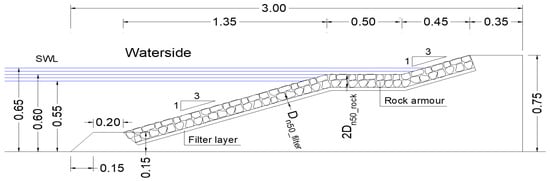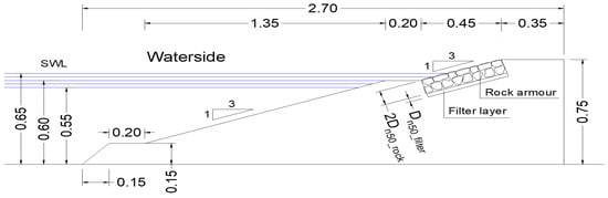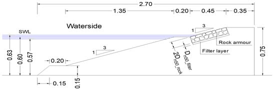 Figure 10. Test configuration (unit: m) of the R3WB tests, with rock armour on the entire slopes with a wider berm (0.5 m) than Model R3 (0.2 m) and the same test conditions as R1N. = 5 cm and = 2.5 cm.
