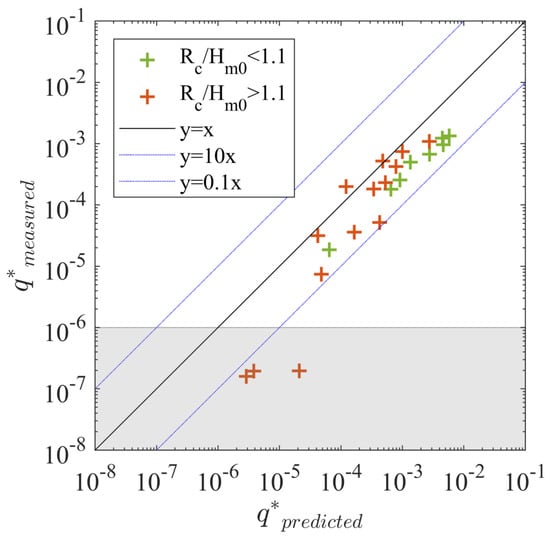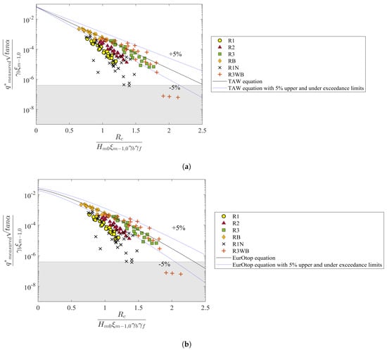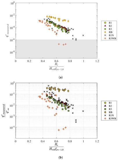 This section presents the results of measured average overtopping discharges from the physical model tests. All the experimental data are plotted in Figure 11a with the relative freeboard on the horizontal axis and dimensionless average overtopping discharge ( = ) on the logarithmic vertical axis. Figure 11a shows that the measured dimensionless mean overtopping discharges cover a wide range between and . Note that there also are some data points that have low values of < . However, these small values mostly result in overtopping rates less than 0.5 L/s/m in prototype in reality (which is outside the relevant range) while these very small measured discharges can be affected by scale effects in the model (see for instance, [14,22]). Therefore, those data points inside the shaded area in Figure 11a are discarded in the data analysis in this study. For completeness, four discarded data points are depicted in Figure 11a and in the figures related to the following analysis.