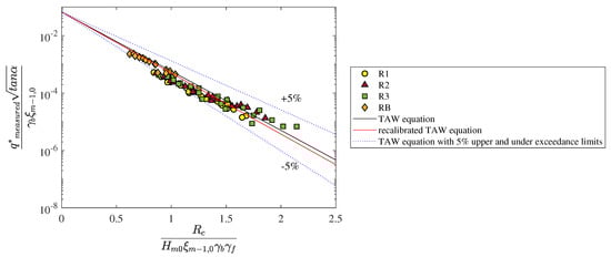 The wave overtopping data and empirical equations are shown in Figure 13, in which is calculated using the Equation (8) and the overall roughness factor for rock armour installed on parts of slope surface is calculated by applying Equation (3). Equation (7) is used to calculate the berm influence factor for the rock berm. There is only a slight difference between TAW equation and the recalibrated TAW Equation (4), which means that the application of Equation (4) leads to a limited improvement of the predictions of average overtopping discharge. In contrast, Figure 13 shows that the new berm and roughness equations for rock armour contribute to much less scatter than TAW and EurOtop methods presented in Figure 12. The data points calculated by using the new equations are more concentrated around the empirical equation lines compared to existing Equations (A5)–(A7) for the roughness and berm influence.