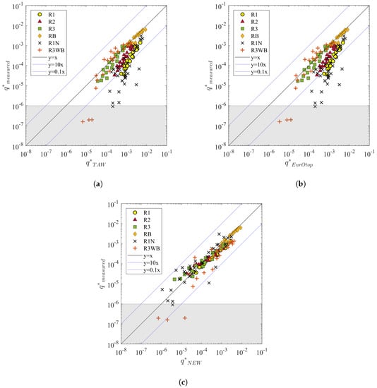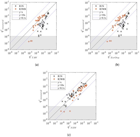 Comparisons of dimensionless average overtopping discharges between the measured and the predicted values for the Datasets R1N and R3WB using (a) the TAW equations given by [6], (b) the EurOtop equations given by [10] and (c) the new equations.