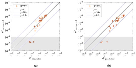 To explain possible causes for the reduced performance of the new equations for the structure with a very wide berm, further analysis is performed by analysing whether the expression for the berm (Equation (7)) or the expression for the roughness (Equation (8)) contributes the most to the reduced performance for a very wide berm. Therefore, the data for the wide berm (Dataset R3WB) is compared to the new berm equation (Equation (7)) in combination with the TAW roughness value, and to the new roughness equation (Equation (8)) in combination with the TAW berm equation. Figure 16 shows the results by using the new equation for the berm influence (Equation (7)) combined with the roughness factor of 0.55 recommended by [6]. By comparing Figure 16a with Figure 15a, we can see that the results are similar to those given by TAW. The factors for the data in Figure 16a and Figure 15a are 0.75 and 0.81 respectively, which means that the new berm equation performs with similar accuracy as the TAW berm equation for this very wide berm (0.5 m). Figure 16b shows the results using the new equation for the roughness Equation (8) combined with the TAW berm Equation (A7), indicating the new roughness equation results in an overestimation of average overtopping discharge. The factor decreases from 0.81 for TAW to 0.36. Thus, it is the new roughness equation (Equation (8)) that mainly reduces the accuracy of the new set of equations for a very wide berm. The possible cause of the overestimation given by the new roughness equation is that this equation (Equation (7)) overestimates the overtopping for small relative freeboard as shown in Figure 17. Similar results are also found in Figure 6 in [17] in which some data with deviate from the fitting curve, resulting in an underestimation of roughness influence on average overtopping discharge. This underestimation of the roughness influence is limited in Dataset R1N as the rock armour is only applied on the upper slope. Thus, further research on roughness influence for smaller relative freeboard (), is needed to further improve the predictions of the overtopping discharge, especially for cases with combined wide berms and roughness elements applied on the most of or the entire waterside slope surface.
