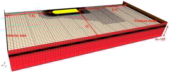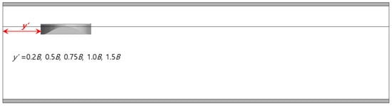 To examine the change of the hydrodynamic forces and flow field because of the ship-bank distance, the distance from the starboard to the bank, as shown in Figure 2, was defined as y′. The simulation was performed under five states: 0.2B, 0.5B, 0.75B, 1.0B, and 1.5B. When y′ = 0.5B, the port distance was set to 2.0L lateral from the center line.