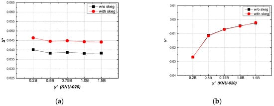 First, as for the results of the surge force, both barges demonstrated that the surge force value corresponding to the total resistance increased, because of the installation of the skeg. KNU-030 with a square-shaped bow demonstrated a higher surge force compared to KNU-020 with the round-shaped bow. KNU-020 showed the largest X′ at y′ = 0.2B when it was closest to the bank. However, the X′ of KNU-030 decreased, because it was closer to the bank. Zou and Larsson [] and Van Hoydonck et al. [] studied the bank effect of KVLCC2, showing that X′ increased as the ships became closer to the bank. The bow of KNU-030 used in this study is different from that of KVLCC2 or KNU-020; thus, the distribution of surge force was shown differently.