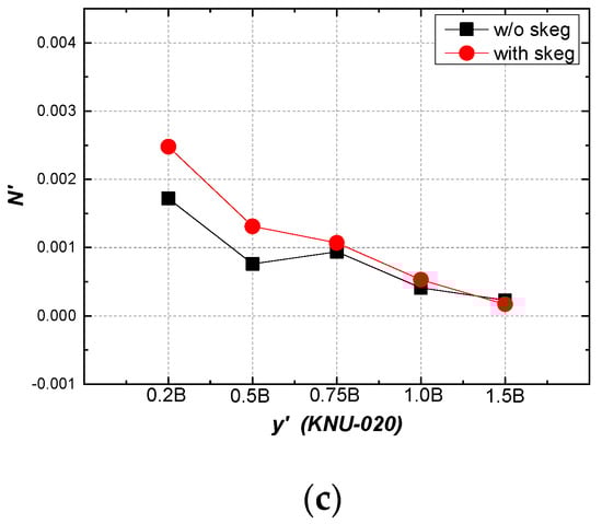 Figure 7 shows KNU-020 at y′ = 0.5B. The port–starboard pressure difference in the shoulder was not significant, and the pressure in the area toward the end of the bow shows that the starboard side was somewhat higher than the port side. The port side pressure was somewhat higher at the end of the stern; thus, this and the higher starboard pressure from the shoulder to the end of the bow may have caused the bow-out moment.