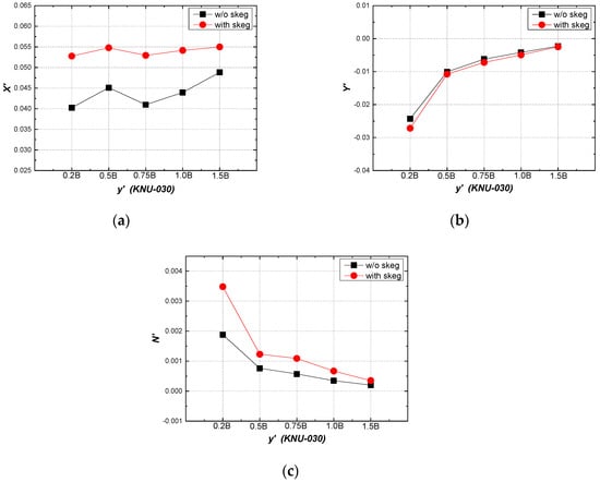 Figure 4 and Figure 5 show the hydrodynamic force changes, based on the difference in the distance from KNU-020 and KNU-030 barge to the bank, respectively. Surge force (XH), sway force (YH), and yaw moment (NH) used the nondimensionalized value shown below, which shows cases with, and without, skeg.