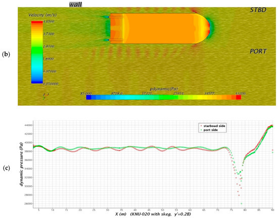 Next, the study compared the characteristics of the flow field, based on the barge-bank distance and the subsequent hydrodynamic pressure distribution on the barge because of such fluid flow. Figure 6 shows the (a) wave pattern, (b) velocity field with line integral convolution and hydrodynamic pressure distribution on the bottom, and (c) hydrodynamic pressure on the starboard and port side of KNU-020 barge at y′ = 0.2B, when it is closest to the bank. The hydrodynamic pressure is attributed to the subtraction of the hydrostatic pressure from the total pressure. Hydrodynamic pressure in Figure 6c indicates the pressure distribution of 3 m up from the bottom of the barge. Note that the starboard side is closer to the bank. Figure 6b,c show the increase in flow speed, and the pressure decrease because of the bank effect in the shoulder of the starboard side of the bow. The flow speed in the port side relatively decreases such that the pressure becomes higher than that of the starboard. However, the area toward the end of the bow from the shoulder demonstrated that the pressure on the starboard side becomes higher as the flow speed in the starboard becomes slower compared to the port side. It is estimated that because of this pressure difference from the shoulder to the end of the bow, the bow-out moment that pushes the bow outward from the bank occurs. The analysis of the pressure distribution from the shoulder to the stern demonstrates that the port side pressure gradually increases more than the starboard side pressure. Because the port side pressure tends to be higher than the starboard side pressure, the suction force that pushes the barge from port to starboard side occurs. The starboard side pressure shows oscillating because of the reflective waves from the bank, which can be shown in Figure 6a. It is believed that the diverging waves due to the progress of the barge do not move away from the barge, and return to the barge after being reflected from the bank, causing the change in the hydrodynamic force.
