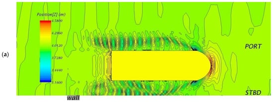 In the references Zou and Larsson [], Ma et al. [], and Liu et al. [] that used CFD for bank effect analysis, the effect of free surface was not considered; however, Hoydonck et al. [], which did consider the effect of free surface, compared the calculation results at y′ = 3/4B, the relatively large distance at intermediate depth such that they reported that the effect of free surface modelling was not significant. As ships will be influenced more by the reflected waves from the bank as they become closer to the bank, it is necessary to determine how this will affect the hydrodynamic forces on the ships.