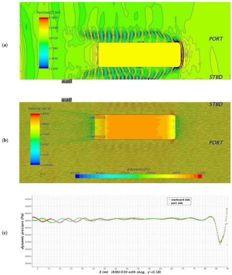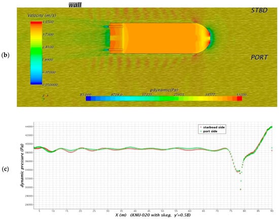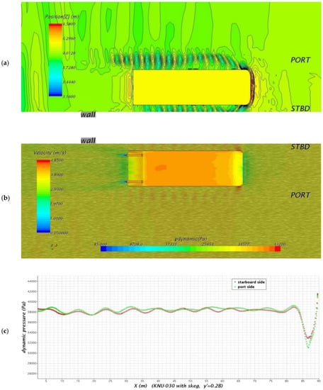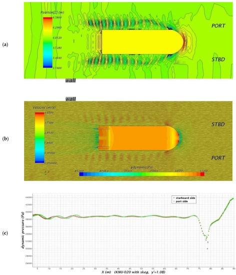 Simulation results for KNU-020 at y′ = 0.5B: (a) wave pattern; (b) velocity field with line integral convolution and hydrodynamic pressure distribution on the bottom; and (c) hydrodynamic pressure on the starboard and port side.