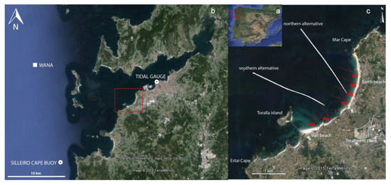 Two possible routes were designed according to the bay morphology (Figure 1). In the southern alternative, the pipeline departed from the southern sector of the bay, specifically from the rocky outcrop located between the Samil and Vao Beaches, with a direction of 300° (with respect to the north clockwise). In the northern alternative, the pipeline departed from the central sector of the bay, close to the current submerged pipelines, with a direction of 340° (with respect to the north clockwise).