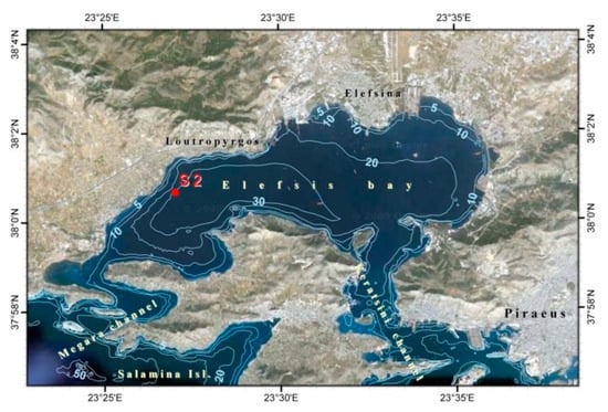 Bathymetric map of Elefsis Bay (Saronikos Gulf, Eastern Mediterranean Sea). The location of the sampling site is also shown [].