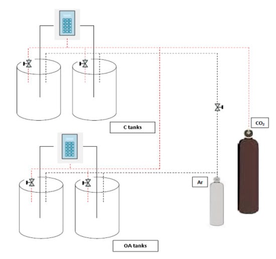 Design of the experimental set-up. Two tanks for each pH treatment (ocean acidification conditions/treatment (OA) and control factor conditions/treatment (C)), the IKS system monitoring the CO2 gas supply and Ar supply.