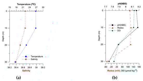 Vertical distribution of physicochemical characteristics. (a) Temperature in °C, salinity in psu and (b) pH in the NBS scale, Redox potential in mV, DO in μmol kg−1, during field sampling (September 2014).