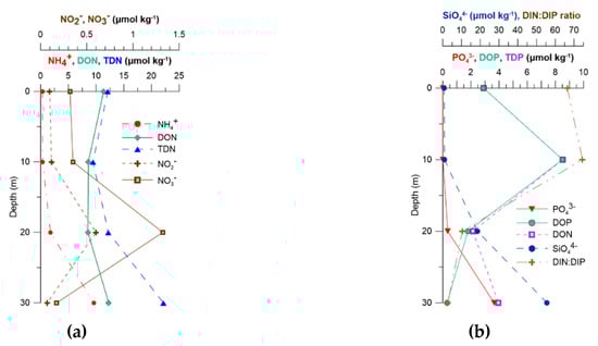 Vertical distribution of nutrients. (a) NO3−, NO2−, NH4+, dissolved organic nitrogen (DON) and total dissolved nitrogen (TDN) in μmol kg−1 and (b) PO43−, dissolved organic phosphorus (DOP), total dissolved phosphorus (TDP) and SiO44− in μmol kg−1 and DIN:DIP ratio during field sampling (September 2014).