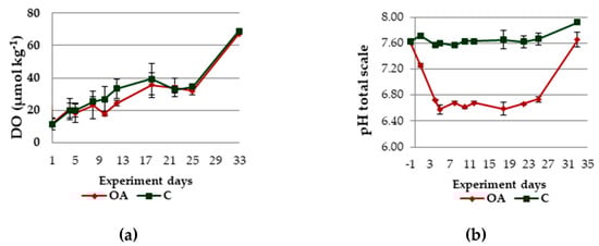 DO concentrations (in μmol kg−1; (a)) and pHT (b) for the duration of the experiment; mean values and standard deviations for the two replicates of each treatment (OA: Ocean acidification condition, C: control condition).