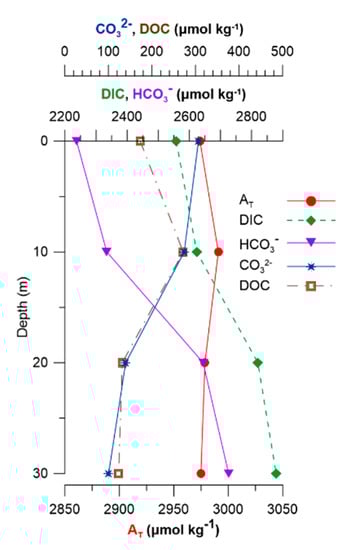 Elefsis Bay vertical distribution of bicarbonates and DIC appear similar (Figure 6), increasing below the pycnocline. Bicarbonates trend reinforces the hypothesis that apart from sedimentary carbonate dissolution, anaerobic processes (e.g., sulfate reduction, ammonium prevalence due to OM remineralization, etc.) produce significant amounts of HCO3− []. What was found here is that DIC and AT seem to associate with different processes; apart from bicarbonate production, which augment both parameters, sedimentary carbonate dissolution contributes more notably to AT than to DIC (by definition of AT; []) and possibly organic substances and nutrient species also significantly contribute (positively or negatively) in AT content.