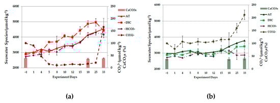 Seawater sampling from the microcosms was performed approximately every 3 days and analyzed immediately for dissolved oxygen (DO) and total alkalinity (AT). Additional water subsamples were collected and filtered through 0.45 μm polycarbonate membranes for storage in −18 °C and further analyses of dissolved organic carbon (DOC), nitrate (NO3−), nitrite (NO2−), ammonia (NH4+), total dissolved nitrogen (TDN), phosphate (PO43−), total dissolved phosphorus (TDP) and silicate (SiO44−). The methods of determination as well as the analytical errors of all the above chemical parameters are described in detail in []. Dissolved organic nitrogen (DON) and phosphorus (DOP) were calculated by subtraction of dissolved inorganic nitrogen forms (DIN) from TDN and of phosphate from TDP. The rest of carbonate system parameters, pCO2, CO2 concentration, dissolved inorganic carbon (DIC), bicarbonates (HCO3−), carbonates (CO32−), aragonite’s and calcite’s saturation states (Ωar and Ωcalc respectively) were calculated through the CO2SYS (v.2.1) software package [] based on pHT and AT values. Phosphate, silicate and ammonia concentrations were used as well for this computation; NH3 concentrations were calculated through NH4+ and pH values according to []. The CO2SYS calculations were performed using the apparent dissociation constants of carbonic acid (K1 and K2) of [], the equilibrium constant of hydrogen fluoride of [], the stability constant of hydrogen sulfate ion of [] and the boron to chlorinity ratio of [].