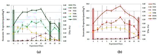 Nitrate, nitrite, ammonium, DON concentrations (in μmol kg−1) and sedimentary TN (in %) for the duration of the experiment for (a) C and (b) OA conditions (x-axis: days of the experiment; mean values and standard deviations for the two replicates of each treatment.