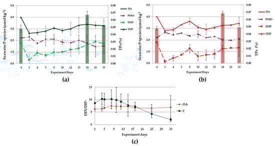 Phosphate, DOP concentrations (in μmol kg−1) and sedimentary TP (in %) for the duration of the experiment for C (a) and OA (b) conditions; DIN:DIP ratio for both conditions (c); (x-axis: days of the experiment; mean values and standard deviations for the two replicates of each treatment).