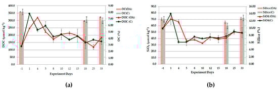 DOC concentrations (in μmol kg−1) and sedimentary OC (in %; (a)); silicate (in μmol kg−1) and sedimentary silica (in %; (b)) for the duration of the experiment for OA and C conditions (x-axis: days of the experiment; mean values and standard deviations for the two replicates of each treatment).