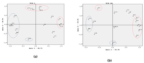 Principal component analyses (PCA) graphs for (a) C and (b) OA treatments. Red circles indicate positive significant correlations while blue circles indicate negative significant correlations.