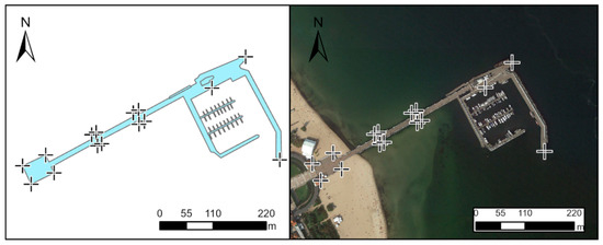 ArcGIS software was used for data processing. Satellite images from Copernicus and Landsat were used for the analyses and constituted a source of data on the coastline course. For these images to be cartometric, they had to be given in a specific coordinate system. Therefore, taking into account the scale of these images, the first stage of works was undertaken, i.e., georeferencing [47] (Figure 1). This process was based on the determination of control (reference) points for both the vector layer (pier model), drawn on the basis of a topographic map from the Geoportal website and a satellite imagery. Once these were determined, raster calibration was conducted, i.e., transformation and recording information about the given spatial reference. For research purposes, the pier model and satellite image were fitted into the Universal Transverse Mercator (UTM) system for publishing nautical charts [48].