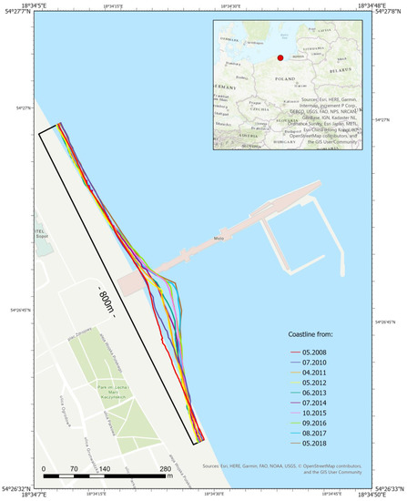 The coastline is a dynamically changing boundary between land and water [1], characterized by instability and functional diversity depending on the region [2]. This boundary is important for the ecological and economic policies of coastal states because areas located in the coastal zone are rich in natural resources. This results in about 50% of the world’s population being currently settled in zones located within 100 km from the coastline [3]. Therefore, coastal monitoring research is currently being conducted in areas such as deltas and estuaries [4,5], wetlands [6], bays [7] and other geographical forms along the coast [8].