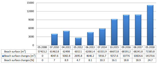 Beach surface changes in Sopot between 2010–2018 compared to 2008.