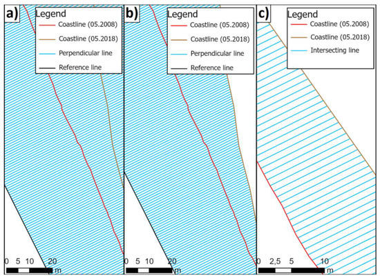 Analysis of coastline variability in Sopot using the Digital Shoreline Analysis System (DSAS) model: drawing perpendicular lines to the reference line (a), intersecting perpendicular lines between the 2018 coastline and the reference line (b) and calculating distances between the 2008 shoreline and the land–water boundary determined for 2018 (c).