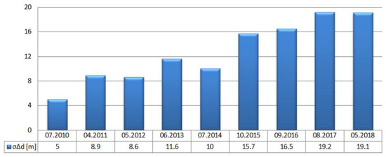 It was possible to calculate the standard deviation of the distance between the 2008 shoreline and the land–water boundary determined between 2010–2018 (Figure 6):