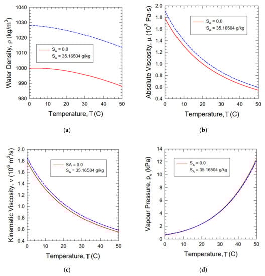 (a) Density, (b) dynamic viscosity, (c) kinematic viscosity, and (d) vapor pressure of freshwater and seawater [8].