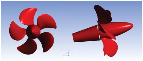 Schiffbau-Versuchsanstalt Potsdam (SVA) created a propeller design known as the PPTC1 model VP1304 for research and validation purposes. The experimental data and geometries are published on the company’s website (www.sva-potsdam.de/pptc). Previous research used the VP1304 model for numerical simulation and validation data, and it was used at the Fourth International Symposium on Marine Propulsors 2015 (SMP’15) [27]. The significant advancement of computer performance has made more numerical simulation possible. Numerical prediction of propeller performance under cavitating flows using CFD simulation has become a good alternative to experimental study. The VP1304 propeller was applied to simulation cases 1–3, displayed in Table 1. The 3D model was downloaded from the website. The VP1304 five-bladed, controllable pitch propeller has a right-handed direction of rotation (see Figure 2). The propeller has a pulling configuration positioned with inclination toward the flow direction.