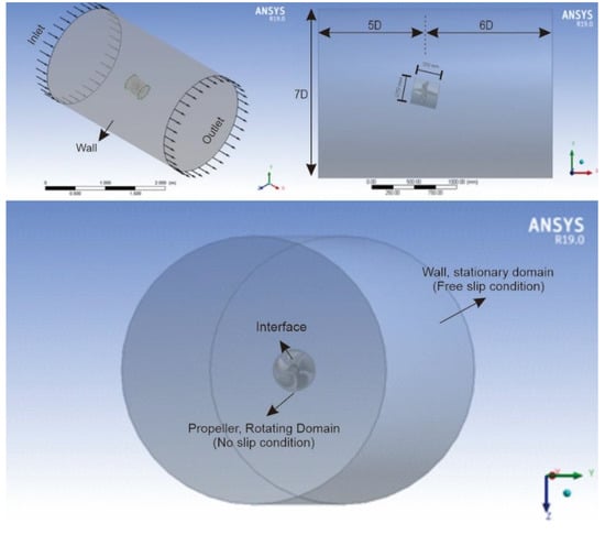 For the simulation under consideration, the computational domain was a cylinder, as shown in Figure 3. The VP1304 propeller has a diameter, D, of 250 mm. The rotating domain had a width and length of 270 mm and 300 mm, respectively. The inlet boundary was placed at a distance of 5D and the outlet was placed at a distance of 6D from the propeller plane. The fixed domain diameter was extended to 7D overall.