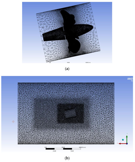 The preferred type of meshing for the propeller is with an unstructured grid and hybrid mesh, which gives high accuracy. In this study, rotating and fixed domain parts were separated. The mesh was generated using the solver mesh of CFX (see Figure 4). The domain initialization for rotating was set with an automatic method, and the fixed domain was established as the tetrahedron method. For the interface of rotating and fixed, CFX solver is capable of joining the meshing approach using a generalized grid interface (GGI). To minimize the number of mesh elements and increase the mesh density, we applied the mesh sizing with the body of influence selection, to approach more accuracy for the critical section. Then, to obtain the viscous effect as the turbulent boundary layer, we placed 11 layers with inflation on the propeller surface. All simulation meshes had the same value of of approximately 10 for all propeller surfaces. After convergence, there were 7,301,426 elements and 2,275,988 nodes for the element mesh rotating domain and 2,452,774 elements and 417,994 nodes for the fixed domain. The value can be defined with the following equation [29]: