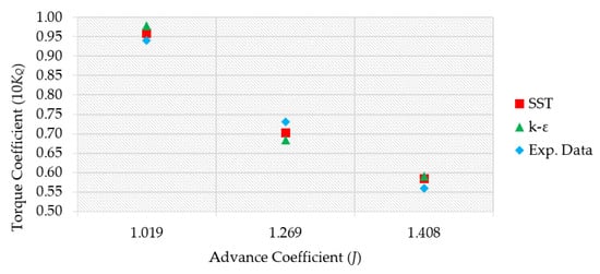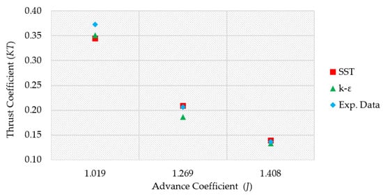 Based on the data shown in the tables, there are differences in the results of simulation data in experiments with variable errors, assuming steady state and heat transfer during the process were set with total energy. Comparisons revealed that the predicted cavitation at the three operating conditions by both turbulence models was in good agreement with the corresponding data. The agreement between predicted propeller based on both models and experiments was good for the coefficients. There was a difference in the relative error value between turbulent k-ε and SST: k-ε gave a smaller value in thrust and relative error at a higher advance coefficient, while SST had more variable results. In general, based on the simulations that were carried out, we could conclude that the turbulent SST model was better for modeling cavitation than the turbulent k-ε model. For this reason, the simulation in the second stage used entirely turbulent SST models. Figure 5 and Figure 6 present a comparison chart of values.