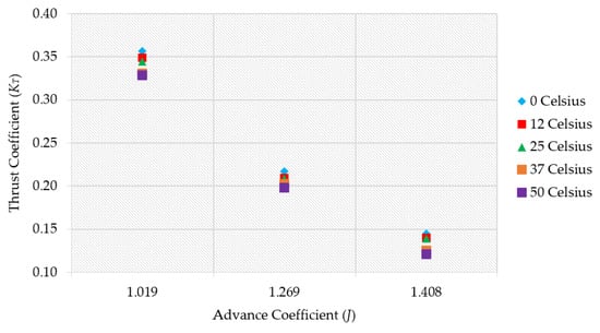 This section shows the results of the simulation. Table 6, Table 7 and Table 8 present the propeller performance parameter data under cavitation conditions. The decreased and increased values of the torque and thrust coefficients were compared with the value in the original case calculation, which was 23.7 °C. A comparison of the performance parameters and is displayed graphically in Figure 7 and Figure 8. Based on the data in Figure 7 and Figure 8, it is known that at a low temperature of 0 °C, the values of the torque and thrust coefficients were almost the same as in normal temperature conditions; this happened in all cases (case 1–3). The same occurred at 12 °C. The trend of increasing cavitation value was characterized by decreased propeller performance with increasing temperature. The difference in ambient temperature greatly influenced the propeller performance under cavitation conditions.