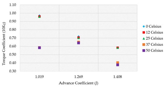 Figure 7 and Figure 8 show comparison graphs of the torque coefficient values. At 37 °C and 50 °C, torque drop occurred in cases 1 and 3, with values dropping significantly compared to normal temperature (25 °C). It is known that the cavitation number influenced the reference pressure, which was close to the water vapor pressure. If the cavitation number is high, the formation of cavitation bubbles becomes very aggressive. This hypothesis was based on research in previous studies stating that play important roles as the primary physical properties that cause cavitation [29]. If cavitation is defined as a decrease in environmental underwater vapor pressure, then the ratio between water vapor pressure and reference pressure becomes inversely proportional. The smaller the ratio, the more aggressive is the inception of the cavitation bubble.