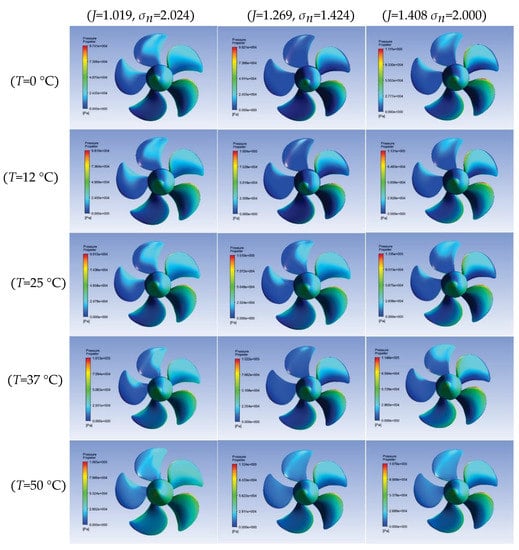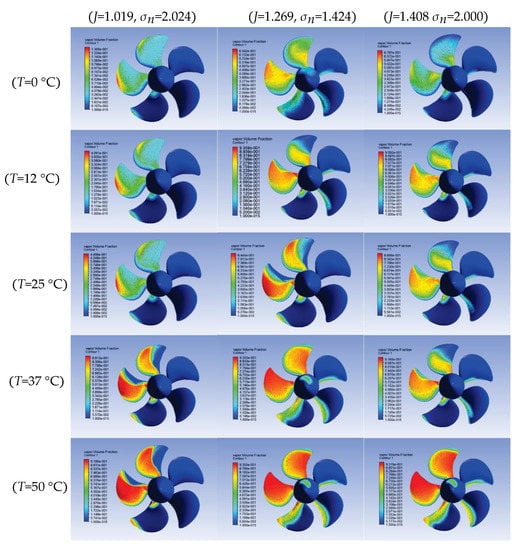 Figure 9 displays the pattern of the vapor volume fraction at a ratio of 0.4. The red area indicates the low pressure at which cavitation bubbles are formed. It can be observed that at higher temperatures, the lower pressure contours of the propeller increase. Vapor density has an important role in cavitation with variable temperature. Water viscosity slightly affects the change in Reynolds number, but it significantly influences the temperature distribution [33]. Figure 9 presents the pressure contour of the propeller suction side. Pressure on the suction side has a relationship with cavitation inception. According to the definition of cavitation, cavitation bubbles will be created in areas where the local pressure is lower than the saturated pressure of water. In Figure 10, blue indicates low pressure areas. In Figure 9, red indicates areas with a high vapor fraction.