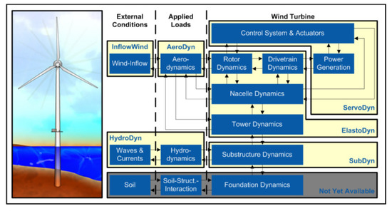 FAST is a computer-aided engineering (CAE) software developed by NREL, which is mainly used to simulate the dynamic responses of a wind turbine. FAST incorporates aerodynamic models (AeroDyn), hydrodynamic models of offshore structures (HydroDyn), control and motor system dynamic models (ServoDyn), and structural dynamic model (ElastoDyn and SubDyn). FAST can simultaneously couple air, fluid, motors, and structures in the same time domain.